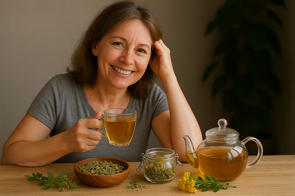 Revitalizační čaj pro hormonální pohodu (univerzální směs): Tato směs je vhodná kdykoli během dne k posílení těla i mysli. Smíchejte 1 díl třezalky, 1 díl meduňky a 1 díl šalvěje. Třezalka zvedne náladu a dodá energii, meduňka zklidní nervy a šalvěj pomůže udržet návaly pod kontrolou. Jednu čajovou lžičku směsi zalijte 250 ml vroucí vody a louhujte cca 8–10 minut. Sceďte. Tento čaj má bylinkově aromatickou chuť – kvůli třezalce lehce hořkou, ale meduňka se šalvějí ji vyvažují. Můžete dosladit lžičkou medu. Čaj lze pít ráno pro dobrý start (třezalka povzbudí náladu) nebo odpoledne pro “dobití baterek”. Neužívejte jej však pozdě večer – kvůli třezalce a šalvěji je mírně stimulující. Pozor: Pokud berete nějaké léky, ověřte si, že vám třezalková složka nebude vadit (viz kontraindikace níže). Jinak je ale tato směs výborným přírodním životabudičem v období, kdy se můžete cítit unavená a psychicky vyčerpaná.