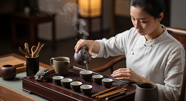 Dávkování čaje: Do nahřáté nádoby vložte doporučené množství čaje (například 5–7 gramů pro gaiwan, nebo přibližně 2-3 gramy na 250 mililitrů vody)